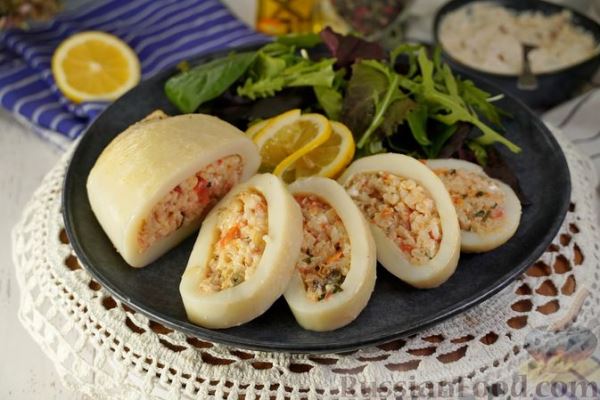 Фаршированные кальмары по-гречески, с рисом и мидиями